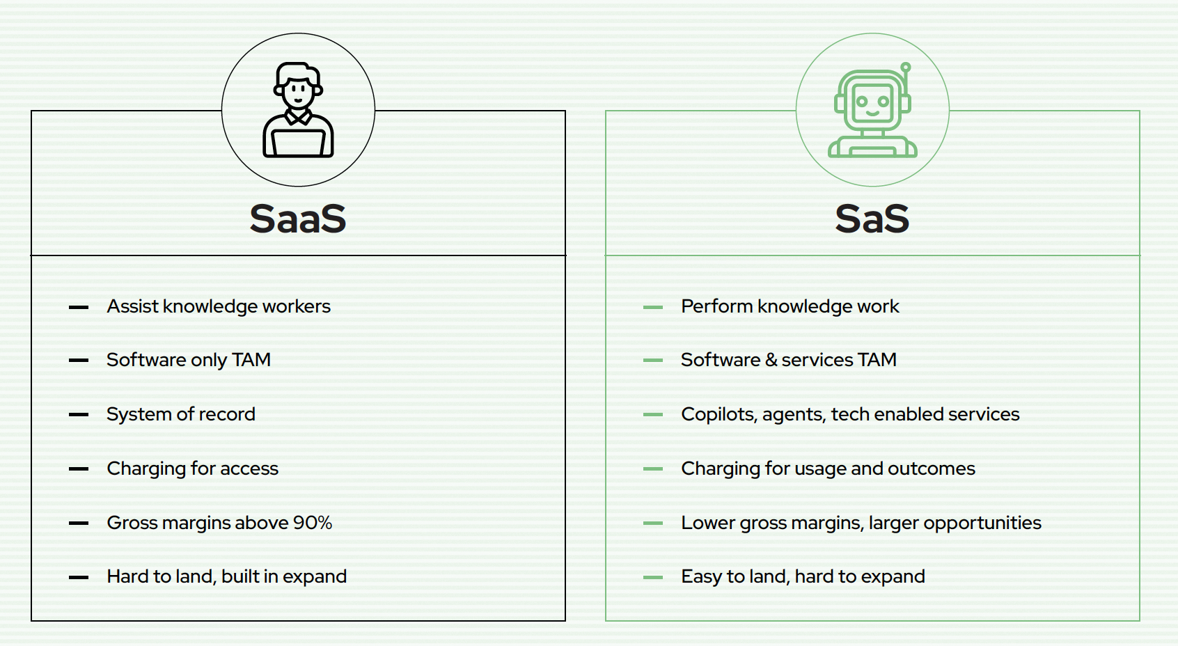 VC has long revolved around SaaS and recurring revenue products because of its development during the formative years of web 1.0/2.0. When software's distribution cost is zero, its unit economics, compared to any other type of business, look phenomenal, and have coined hand-to-heart investor rules like SaaS's Rule of 40. Services did not have a "software" type that gave it a halo, but that's changing with AI (where complex "services" can be replicated with decreasing costs with model actions, whose cost is tied to tokens and who are becoming a new class of workers).