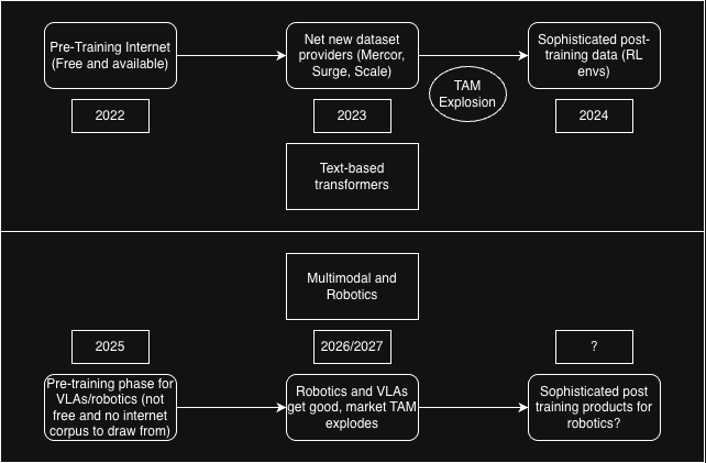 Is the TAM for multimodal data and robotics all of blue collar labor yet? We're probably many steps behind even saying that given the haphazard direction of VLAs and general purpose robotics today - we can't even agree today on whether teleop, egocentric, exocentric, or other types of data will be the most valuable for model training here today. In data modalities without the blessing of the entire internet as a free, diverse, pre-training corpus, we may need to take approaches like Eddy's (Build AI) approach to data scaling, or an alternative algorithmic approach that operates better in data scarce domains.
