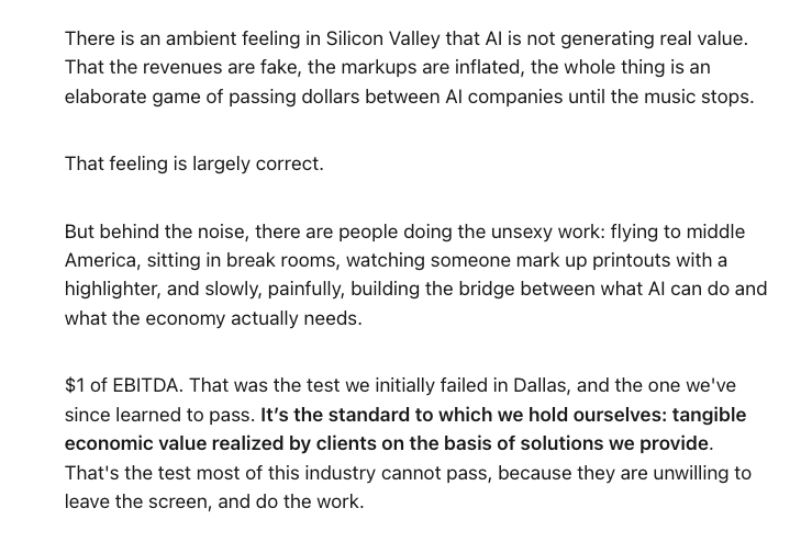 - And many choose to ignore everything I've just said, say fuck it, lets focus on the micro, and charge 8-figure services based engagements for bespoke model training (automations for the most bespoke, but long horizon enterprise use cases) for the likes of Coinbase and Brex and call it venture scalable