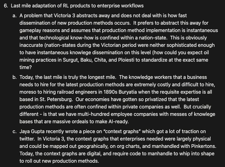 - The diversity of companies they see and work with - like RLaaS companies - such that they're able to tell me stats like "40% of all long horizon enterprise model deployments people struggle with and consider sophisticated post training like RL are actually customer service support chatbots" so we should build generalizable post-training infra for that use case