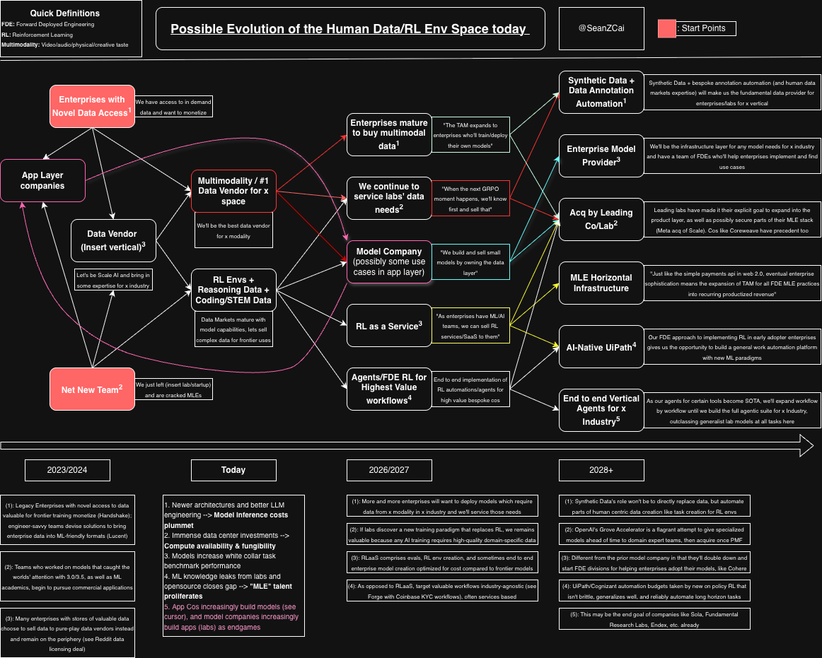 But this isn't even confined to giants. It is really easy to build a startup in this space, realize that you're getting a $1M run rate a month through an extremely intensive ops heavy motion, and relax innovation. Or innovate, just trying to increase the throughput of one of your data production methods, like automated environment creation, without thinking about your place in the data markets. If you want to build a giant, you need to be desperate to monopolize either vertically or horizontally. Already, I've heard of struggling data/rl envs startups in their A raises in the new year, who've copied early Mercor's model internally without special care for platformization and verticalization opportunities.